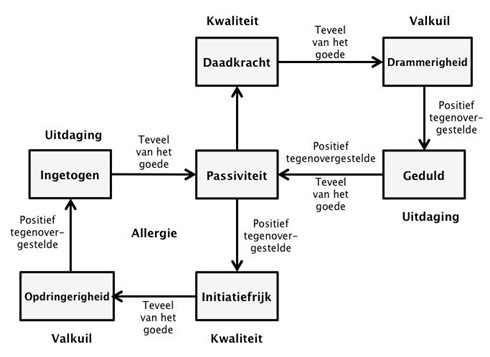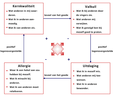• Als je start vanuit je irritaties en ergernissen t.a.v. collega’s, kinderen, partner, vrienden,… geeft het je een mooie kijk op wat die ergernis zegt over jouw kernkwaliteit, valkuil en uitdaging, maar ook over de kernkwaliteit die bij de ander achter die allergie zit. Jouw allergie is immers tegelijk de valkuil van die ander zoals in onderstaand voorbeeld duidelijk is.